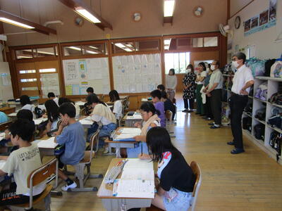 最初に町教育委員会からの委嘱状を交付した後、委員の皆様には3校時の授業を参観していただきました。