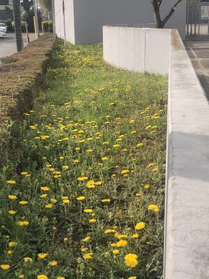 東側の正門付近にはタンポポの黄色い花がきれいに咲いています。