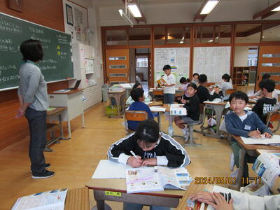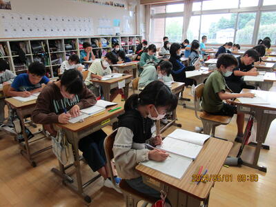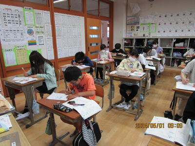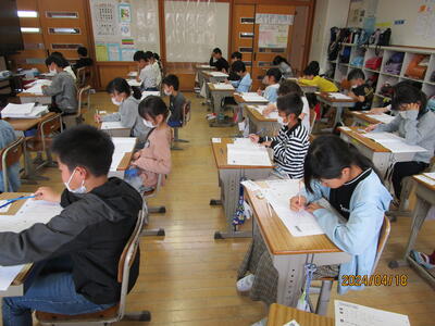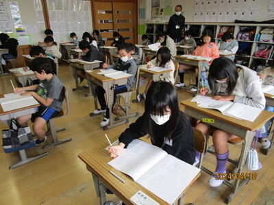 調査問題が配られると、どの児童も真剣な表情で目の前の問題に最後まであきらめず、精一杯取り組んでいました。