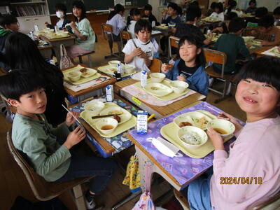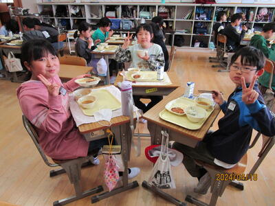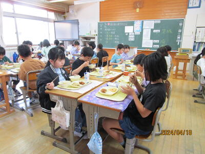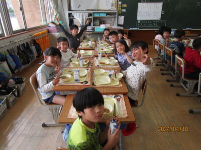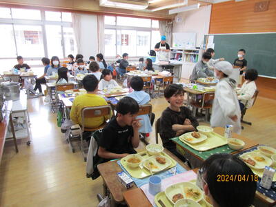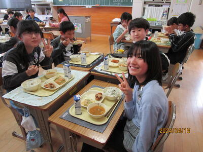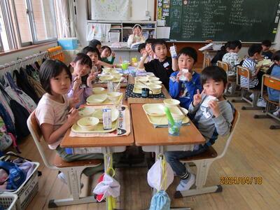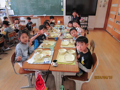 そして、いよいよ給食の準備です。給食当番が配膳室まで行きワゴンを受け取って、各クラスで配膳を行いました。小学校に入学して、初めての給食はお祝いメニューということで、ごはん、牛乳、チキンカレー、コーン入りグリーンサラダに、お祝いいちごゼリーがついていました。おいしく食べることができました。