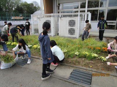春になり暖かい日々が続き花壇の雑草が伸びてきていたところでしたが、先々週末と先週末の2週にわたって、本校のグリーンボランティアの方々が花壇の除草活動を行っくれました。