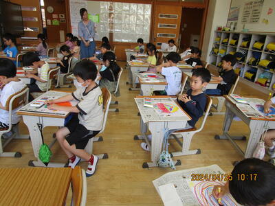 また、図画工作では、春にまつわる絵をかいていました。ピンクや黄色、黄緑色などの色づかいが素敵で、春らしい作品がたくさん完成していました。