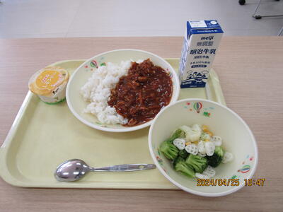 今日の給食は、ハッシュドポークライスに、牛乳、花野菜とパスタのサラダ、レモンゼリーでした。