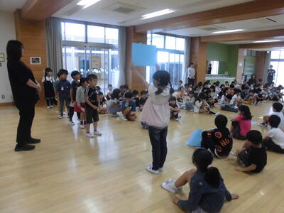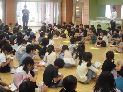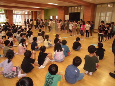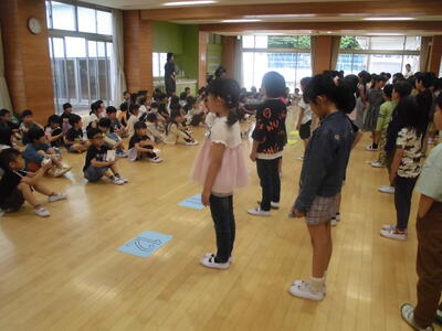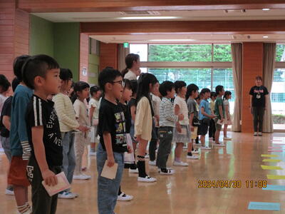 2年生から6年生までの児童が一堂に集まった体育館で8:15からはじまった新任式では、代表児童がお迎えの言葉を述べた後、新しく本校に着任した教職員9名が自己紹介をしました。