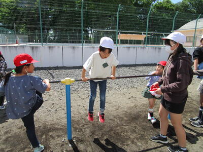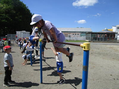 ロングフリータイムほどの長い時間ではありませんが、鉄棒やブランコ、のぼり棒や滑り台の遊具で遊ぶ子、ボールを使って遊ぶ子、虫取りをする子・・・など、それぞれの興味や関心に合わせて遊んでいました。