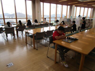本校の図書室は、校舎南東側にあり、ガラス張りでとても明るい図書室となっています。多くの本があり、子どもたちにとても人気の場所です。