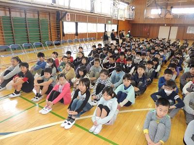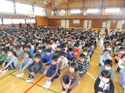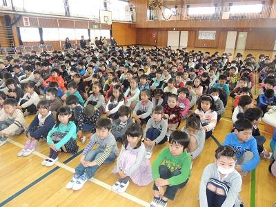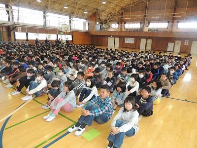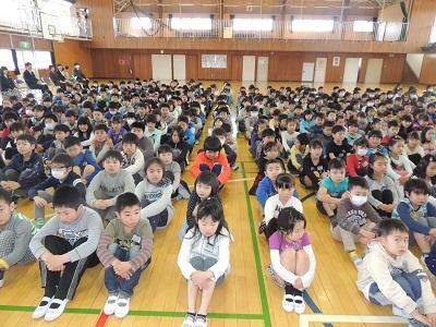 離任式です。ありがとうございました。2~6年生が参加しています。