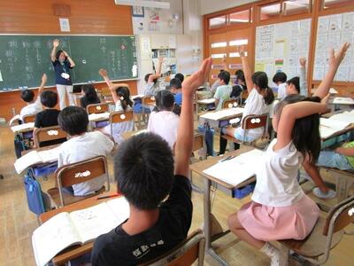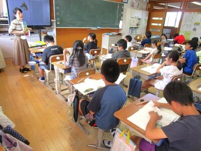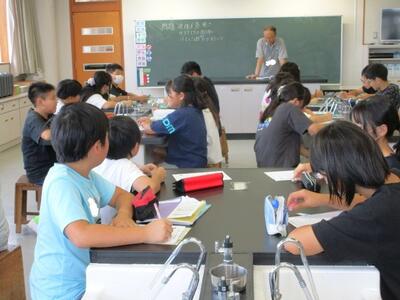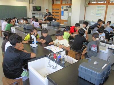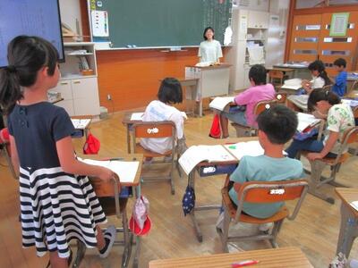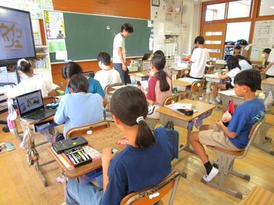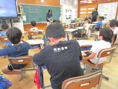 【3年生】1枚目の写真は、理科の「こん虫のかんさつ」の学習の様子です。1枚目の写真で先生が持っているのはアリの模型です。頭や胴体など、大きさの違いに子どもたちは驚いていました。