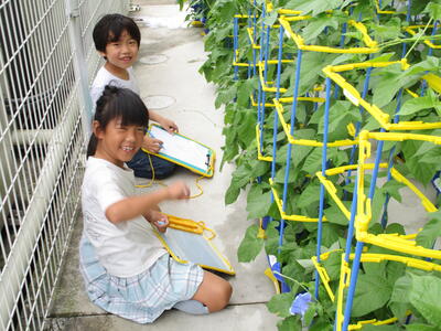 校庭を歩いていると、1年生が大切に育てているアサガオの観察を行っていました。