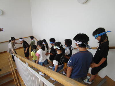 また、アイマスク学習では2人1組となり、ガイド役の児童が目の見えない方が廊下や階段を怪我をしないように安心して移動できるよう、周りの状況を丁寧に伝えながらガイドしていました。