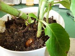現在校舎建築工事が急ピッチで行われています。プール西側も側溝工事のため、歩行しづらくなっています。深く掘り進められた側溝をのぞいていたら、セミの幼虫を発見しました!!急にまわりが明るくなって大慌ての様子です。工事関係者の方にお願いして拾い上げていただきました。トマトの枝にぶら下げたら羽化するかなと思ってトライしたら、すぐに落下・・・。仕方なく校長室まで持ってきて、アジサイの鉢植えにおいてみたら、何と!!いきなり穴を掘り始めました。職員研修があるため、そのままにして出かけましたが、帰ってのぞいてみたら・・・、すっかりもぐり込んでいました!!セミは6年から17年ぐらい地中で過ごすそうです。「羽化してから1週間ぐらいしか生きられない」と聞かされていましたが、実際には1ヶ月近く生きているらしいのです。ちょっと狭いお家ですが、また地中の生活にもどってくださいね!!