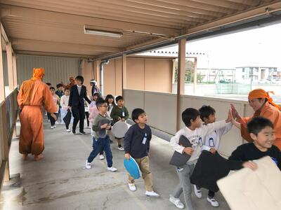 終演後は、キャストの方々に体育館通路で1~5年生のお見送りをしていただきました。子どもたちは笑顔でハイタッチなどをしていました。