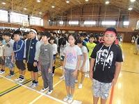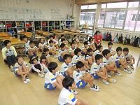 縦割り班に分かれて、ゲーム「何でもバスケット」を行いました。1年生には、6年生が