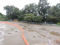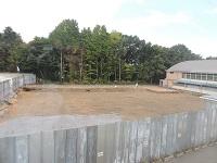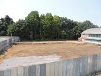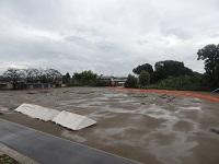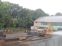 杭打ち機搬入等のために、校庭の一部に鉄板を敷く作業を行っています。9月10日(木)には、元通りになります。プール本体があった所は、整地作業が完了しました。