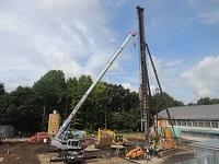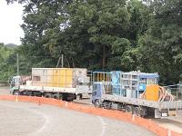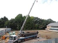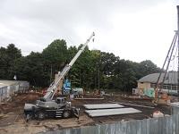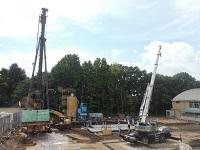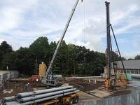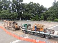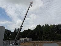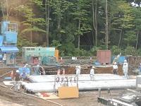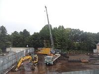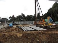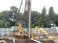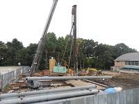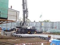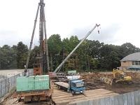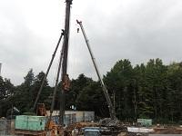 プール工事の様子です。杭打ち機の搬入・組立作業が始まりました。