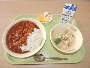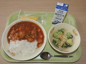 今日の献立は、「ごはん、牛乳、にっこりなしカレー、シーザーサラダ、パインアップル」です。650キロカロリーです。給食センタースタッフの皆様、今日からまたよろしくお願いします。
