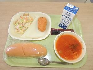 今日の献立は、「コッペパン、チョコクリーム、牛乳、ササミチーズフライ、キャベツのアーモンドサラダ、トマトスープ」です。634キロカロリーです。