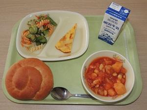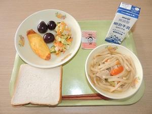 今日の献立は、「しょくパン、だいずマーガリン、牛乳、ツナオムレツ、フレンチサラダ、スタミナうどん、ぶどう」です。623キロカロリーです。