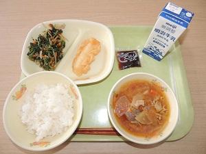 今日の献立は、「セルフいかてんどん(ごはん、いかてんぷら、てんどんのたれ)、牛乳、おひたし、とんじる」です。659キロカロリーです。