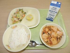 今日の献立は、「ごはん、牛乳、マーボーどうふ、コーンしゅうまい、バンバンジーサラダ」です。668キロカロリーです。