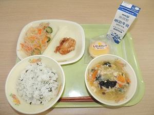 今日の献立は、「わかめごはん、牛乳、とりからあげレモンソースあえ、はるさめサラダ、