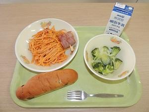 今日の献立は、「ぶどうパン、牛乳、スパゲティナポリタン、ウインナーベーコンまき、グリーンサラダ」です。654キロカロリーです。