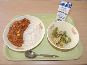 今日の献立は、「むぎごはん、なつやさいドライカレー、牛乳、アスパラときゅうりのサラダ」です。678キロカロリーです。