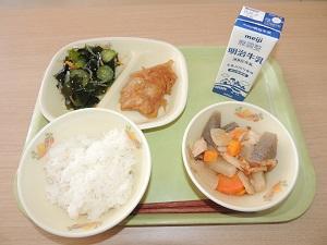今日の献立は、「ごはん、牛乳、さかなのわふうマリネ、わかめといとかんてんのあえもの、だいこんとちくわのにもの」です。650キロカロリーです。