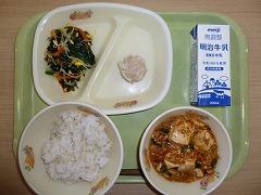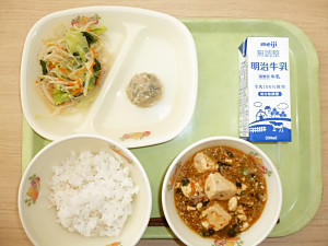 むぎぎはん、牛乳、マーボーどうふ、てんぐにらまんじゅう、ちゅうかサラダ
