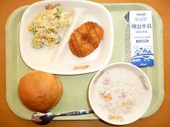コロッケバーガー(丸ぱん、けんさんぶたにくコロッケ)、牛乳、コールスローサラダ、クラムチャウダー