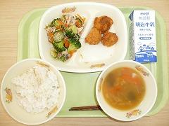 ごはん、牛乳、いもフライ、ブロッコリーとひらたけのサラダ、けんちんじる