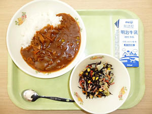ハッシュドポーク、牛乳、ひじきのサラダ