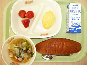 こめこパン、牛乳、アンサンブルエッグ、れんこんとひじきのサラダ、ミネストローネ、セレクトデザート(いちごゼリー/おこめケーキ/チョコケーキ)