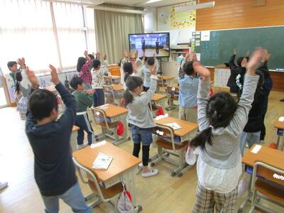 【1年生】今、阿久津中学校の2年生がマイチャレンジ(職業体験)で本校に来てくれています。1枚目の写真は、教室に来てくれた中学生に運動会で踊ったダンスを見せている場面です。