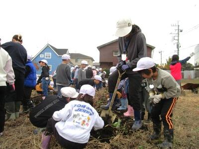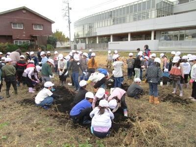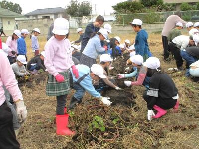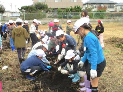 【2年生】今日は、2年生が「サツマイモほり」を行いました。つるをたどった後も、その下にサツマイモがあるのではないかと、一生懸命に探していました。しっかり収穫できました。