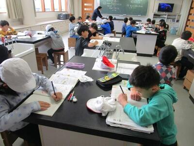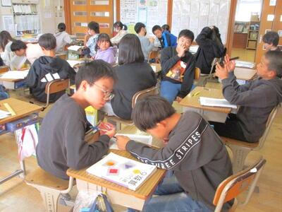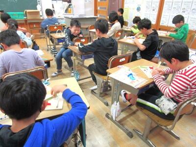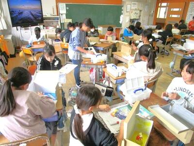 【5年生】1枚目の写真は、図画工作の「のぞいてみると」の学習の様子です。箱の中をのぞいてみると、どんな世界が広がっているのでしょうか。子どもたちは、箱の中の世界づくりに夢中になっていました。