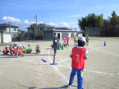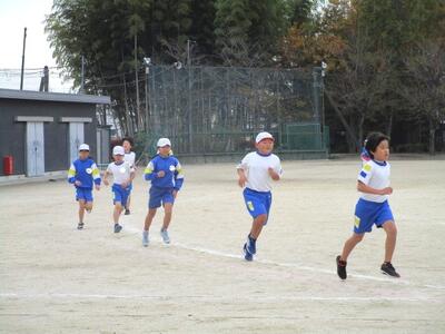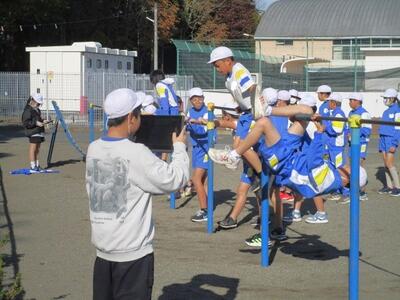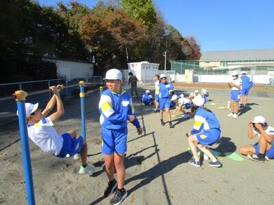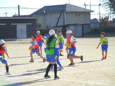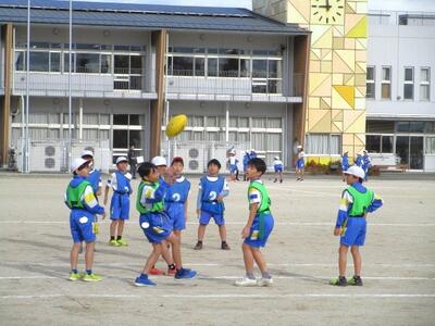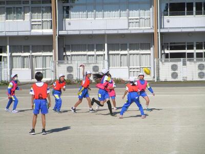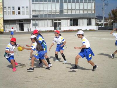 【4年生】1枚目と2枚目の写真は、体育の「タグラグビー」の学習の様子です。いよいよゲームが始まりました。タグを取られないように相手をかわす動きをするのがポイントです。