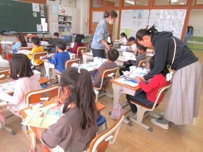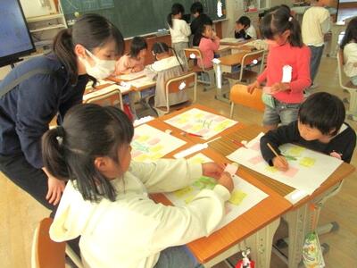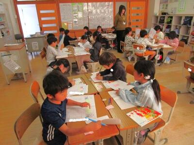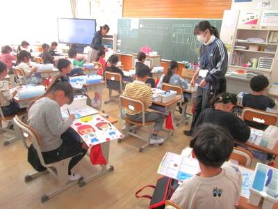 【1年生】1枚目と2枚目の写真は、図画工作の時間の様子です。水彩絵の具を使って、運動会の絵の仕上げをしています。少しずつ慎重に彩色している姿が印象的です。