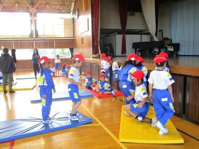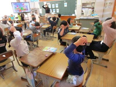 【3年生】1枚目の写真は、外国語活動の時間の様子です。今日は、いろいろな形の名前について学習していました。アクティビティーでは、真ん中に置いた消しゴムをどちらが早くとるかのゲームをしました。