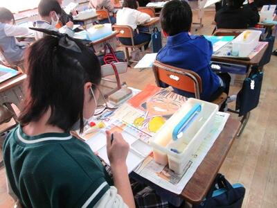 【6年生】1枚目の写真は、図画工作の「わたしの大切な風景」の学習の様子です。学校の中での思い出の場所を絵に表しています。どんな場所を選んだのでしょうか。彩色に入りました。