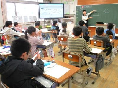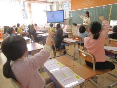 【5年生】1枚目と2枚目の写真は、算数の「比べ方を考えよう(1)」の学習の様子です。単位量当たりの大きさの学習ですから、5年生の学習の中でも一番難しい内容に入りました。
