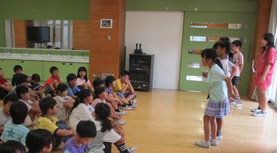 また、お昼のロングフリータイムには、異学年交流(フレンドリータイム)を行っているクラスがありました。今日は3・4年生の2組どうしが交流していました。「爆弾ゲーム」をやっており、4年生が3年生に対して遊び方の説明をしたあと、実際に遊びを通した交流を深め、笑顔で楽しそうに活動していました。
