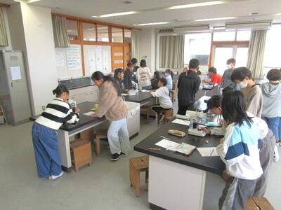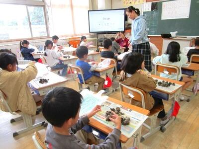 【6年生】1枚目の写真は、理科の「大地のつくりと変化」の学習の様子です。顕微鏡で何かを観察していますね。今日は「火山灰」の観察を行いました。