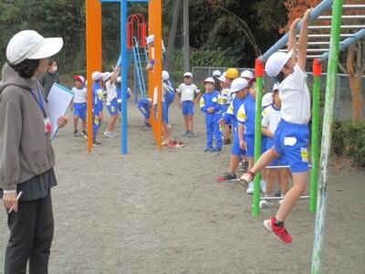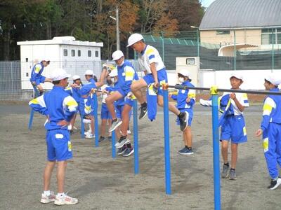 【2年生】1枚目の写真は、体育の「固定施設・鉄棒を使った運動遊び」の学習の様子です。雲梯のわきの棒を手で渡っていったり、のぼり棒を登ったりと、遊び方をいろいろ工夫していました。