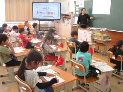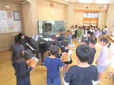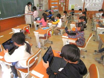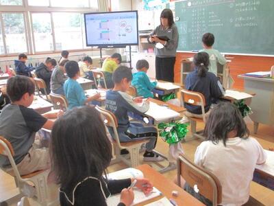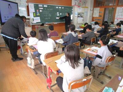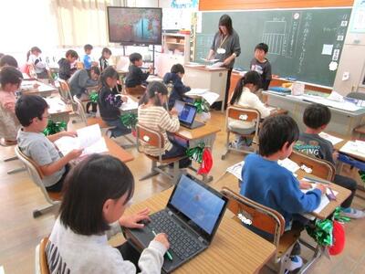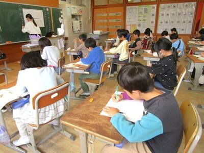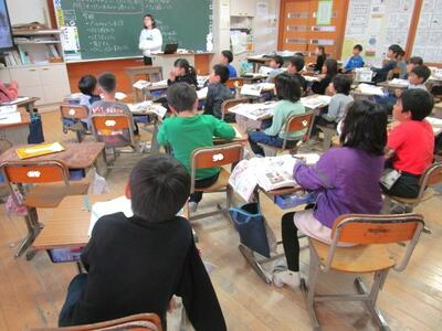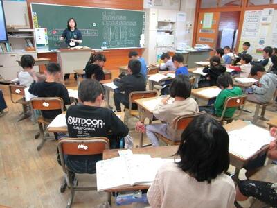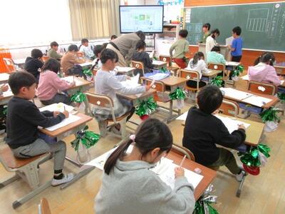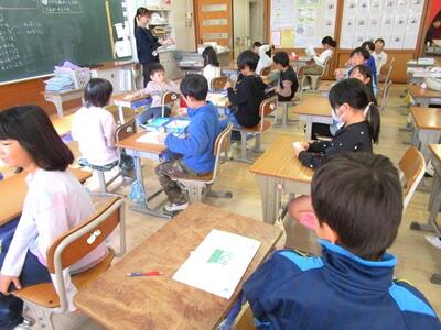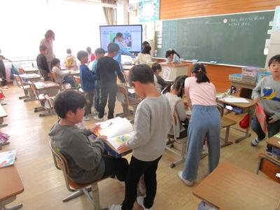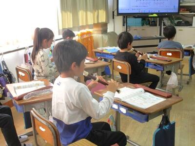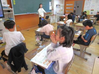 【4年生】1枚目の写真は、音楽の時間の様子です。入るとすぐに「もみじ」を歌う声が聞こえてきました。2つに分かれて輪唱に挑戦していました。