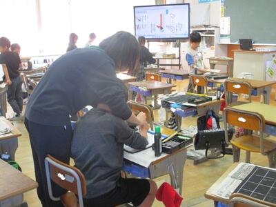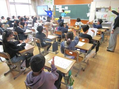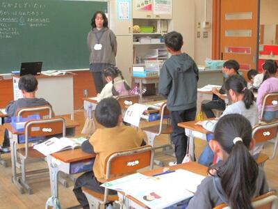 【4年生】1枚目と2枚目の写真は、総合的な学習の時間の様子です。今日は、学校支援のボランティアの方に「手話」を教わりました。子どもたちは、覚えるのがとても速くてびっくりしました。