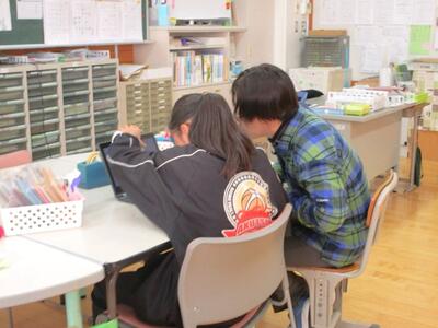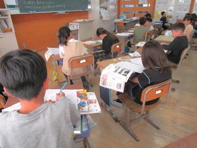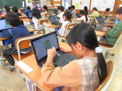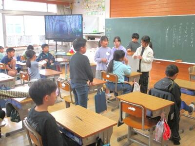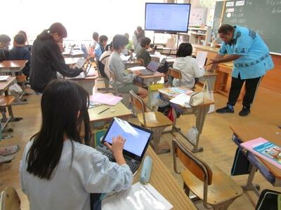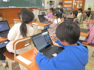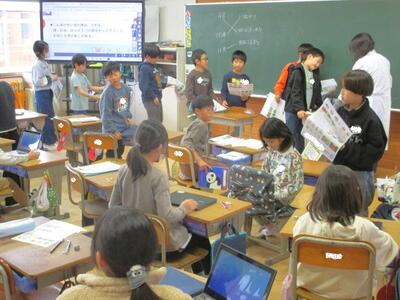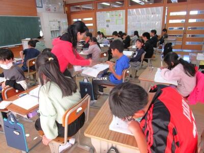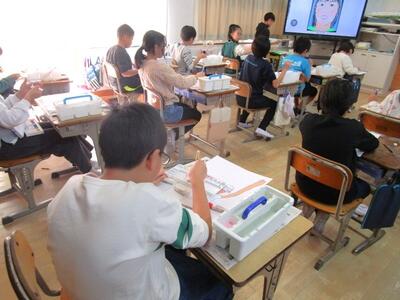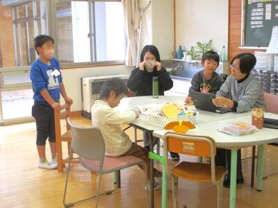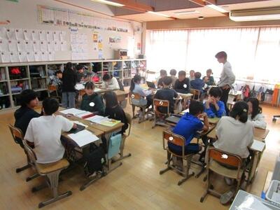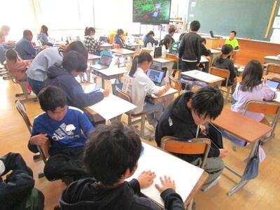【6年生】1枚目の写真は、国語の「みんなで楽しく過ごすために」の学習の様子です。1年生と楽しく遊ぶ計画がだいたい出来上がったようです。今日は、グループごとに発表をして確認をしていました。