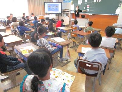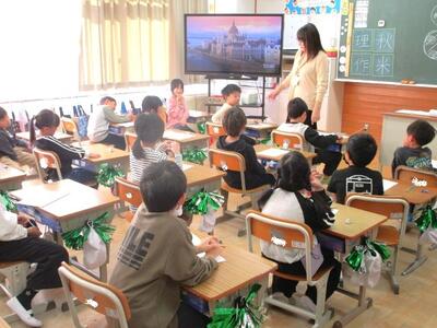 【3年生】1枚目の写真は、外国語活動の時間の様子です。今日は、Whatを使って、好きなものをたずねたり答えたりする言い方を学びました。