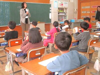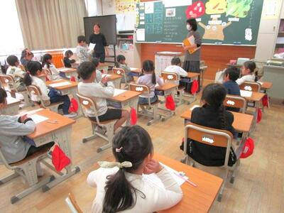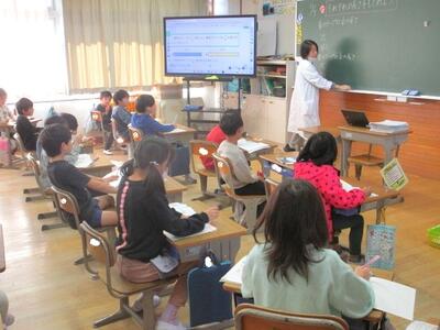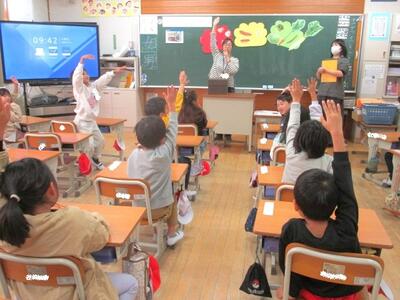 【1年生】1枚目と2枚目の写真は、学級活動の時間の様子です。今日は、食べ物の栄養についての勉強です。野菜など、いろいろな食べ物を食べることの良さについて学んでいました。