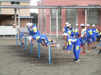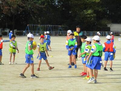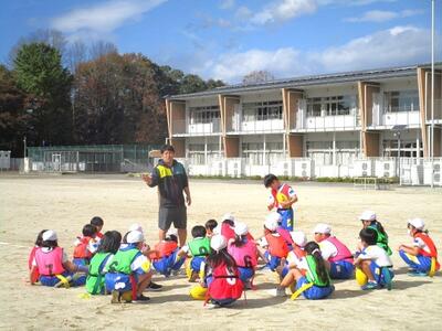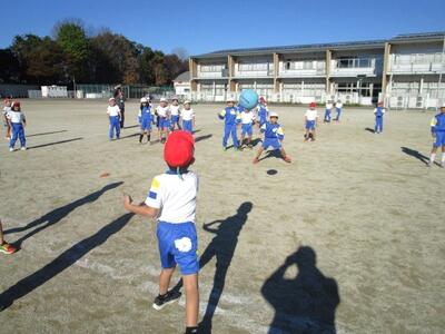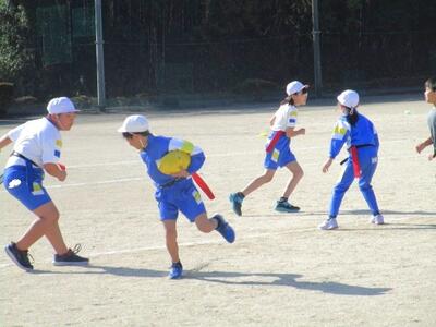 【4年生】1枚目の写真は、体育の「タグラグビー」の学習の様子です。腰のところにタグを付けていて、取られないように躱す練習をしています。子どもたちは夢中です。